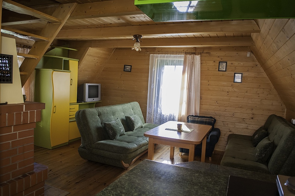 Wszystkie domki posiadają: aneks kuchenny z pełnym wyposażeniem (tj. zastawa stołowa, filiżanki, kubki, szklanki, kieliszki, sztućce, przybory kuchenne, garnki oraz sprzęt taki jak: kuchenka elektryczna, kuchenka mikrofalowa, lodówka, czajnik elektryczny), łazienkę (wc, prysznic, umywalka), salon z kominkiem i TV.